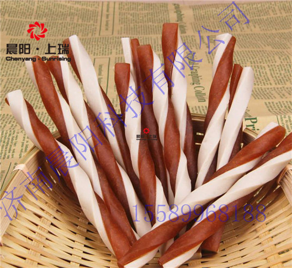 為滿足這一市場需求,晨陽人自公司成立之初,就加大力度投入技術(shù)研究,經(jīng)過十多年不斷摸索和實踐,掌握了成熟的制作狗咬膠的經(jīng)驗和方法。 采用科學(xué)配置的淀粉為原料,使用單螺桿擠壓機擠壓出客戶需求的各種形狀的狗咬膠,通過調(diào)整原料、溫度和水分等工藝參數(shù),生產(chǎn)出來的產(chǎn)品具有形狀新穎、口感獨特、營養(yǎng)豐富、組織細膩等特點。