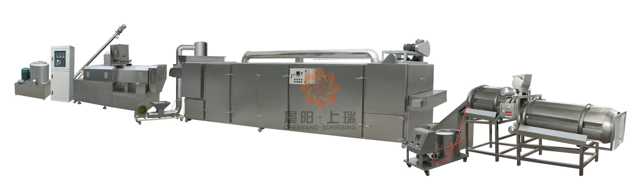 大家都知道:傳統(tǒng)的膨化狗糧顆粒,主要原料是淀粉類的谷物,主要是玉米,肉類超過了一定比例,就不能夠膨化成型,做出來的形狀就不夠美觀。所以,用傳統(tǒng)擠壓膨化工藝的設(shè)備生產(chǎn)出的狗糧顆粒,只能是低蛋白高淀粉類的顆粒。不能夠生產(chǎn)出高蛋白的狗糧顆粒,針對以上原因和市場需求的現(xiàn)實(shí),我們濟(jì)南晨陽科技有限公司,研發(fā)出一整套純?nèi)夤芳Z機(jī)器設(shè)備生產(chǎn)線,只為滿足高端狗糧需求者的客觀需求。