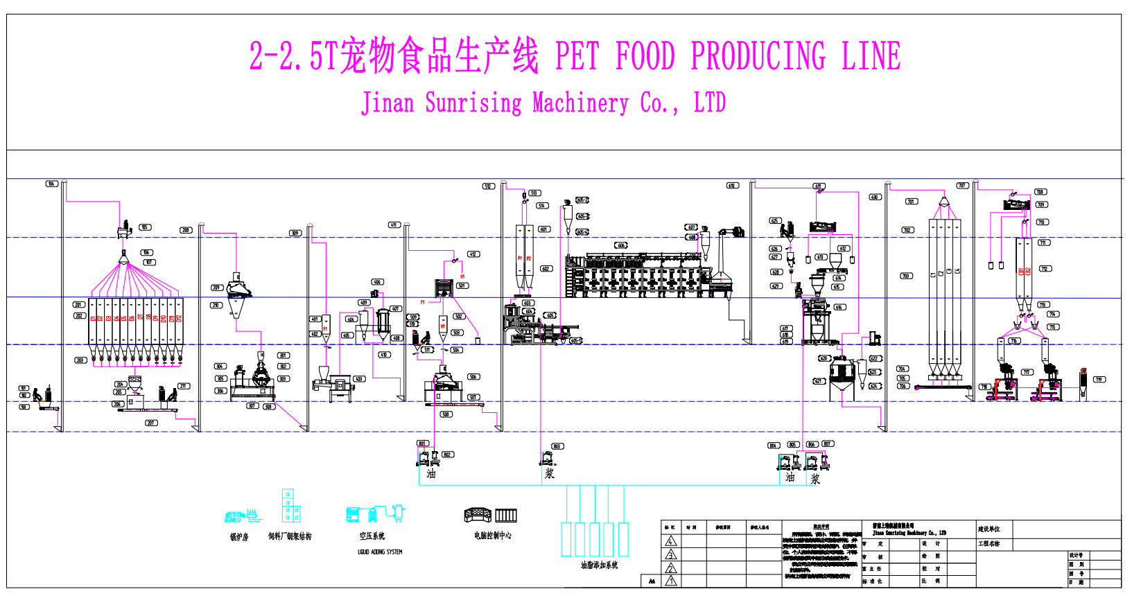 本套2-2.5T/h寵物食品生產(chǎn)線工藝特點(diǎn),因客戶是空地建設(shè),我司設(shè)計(jì)首先考慮工藝流程的順暢,在設(shè)計(jì)上人性化布局,采用4層鋼結(jié)構(gòu)設(shè)計(jì),車(chē)間建設(shè)高度19米(因客戶政府高度限制),工藝方面使用國(guó)內(nèi)主流二次混合,二次粉碎、雙螺桿膨化機(jī)、真空噴涂、逆流冷卻,產(chǎn)品混色,包裝碼垛等全部自動(dòng)流水線。配料倉(cāng)采用12倉(cāng),滿足多種配方配料要求,配料軟件采用布勒系統(tǒng)。配料穩(wěn)定,可儲(chǔ)存多種配方,配料記錄可留檔查詢,原料混合使用雙軸漿葉混合機(jī),混合均勻度≥98%,雙軸混合機(jī)排料殘留低,可保證每批原料的混合均勻度一致,粉碎機(jī)工藝采用粗粉加細(xì)粉,批次粉碎。避免不同原料進(jìn)粉碎機(jī)因過(guò)篩問(wèn)題產(chǎn)生沉降層。粗粉碎使用臥室錘片粉碎機(jī),粉碎細(xì)度20目,產(chǎn)量高。細(xì)粉使用超威粉碎機(jī),刀頭使用鎢合碳化鋼,硬度高。粉碎細(xì)度80目過(guò)篩率95%。保證產(chǎn)品成型表面光滑,無(wú)凹凸顆粒狀。在二次混合添加微量元素和一定比例油脂,提高產(chǎn)品油脂含量。膨化機(jī)使用雙螺桿膨化機(jī),產(chǎn)品穩(wěn)定,烘干使用帶式低溫干燥,微量元素?zé)釗p低,噴涂使用真空噴涂,油脂添加30%。使用翻板逆流冷卻器,冷卻效果好,配置4倉(cāng)暫存?zhèn)},可以存儲(chǔ)4種不同顏色的產(chǎn)品,每個(gè)倉(cāng)存儲(chǔ)可以到6個(gè)小時(shí)膨化產(chǎn)能的產(chǎn)品。可以同時(shí)四個(gè)顏色進(jìn)行混合,包裝方面配置自動(dòng)打包稱,自動(dòng)碼垛機(jī),給帶式包裝機(jī),包裝規(guī)格500g-25kg全部實(shí)現(xiàn)。