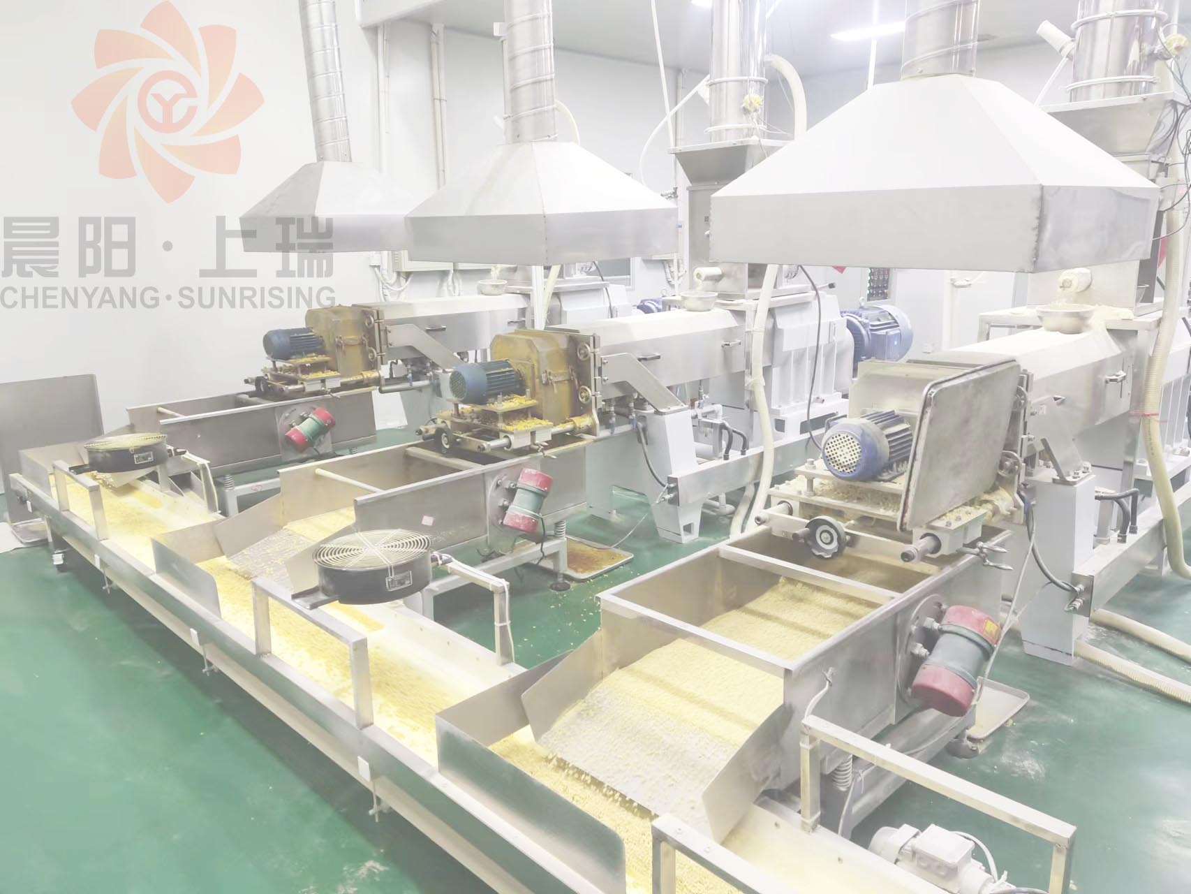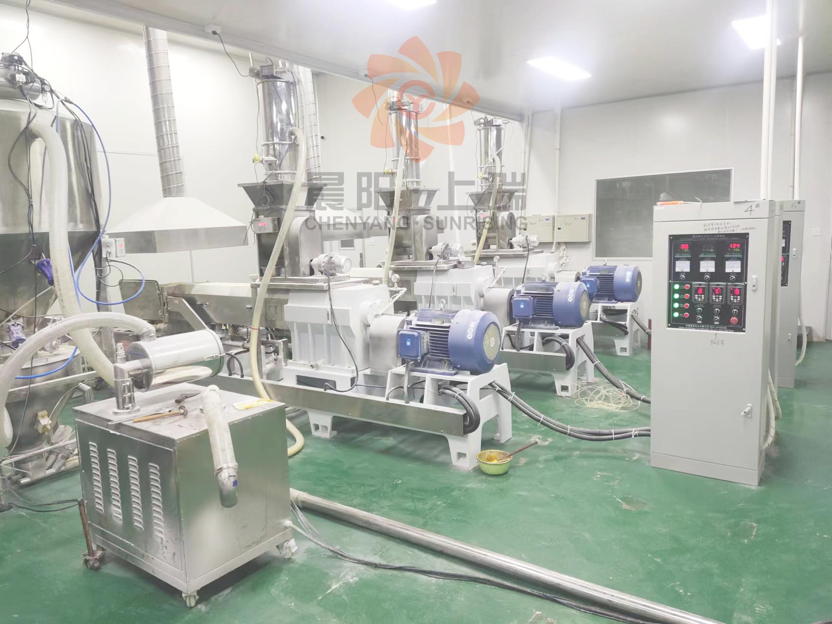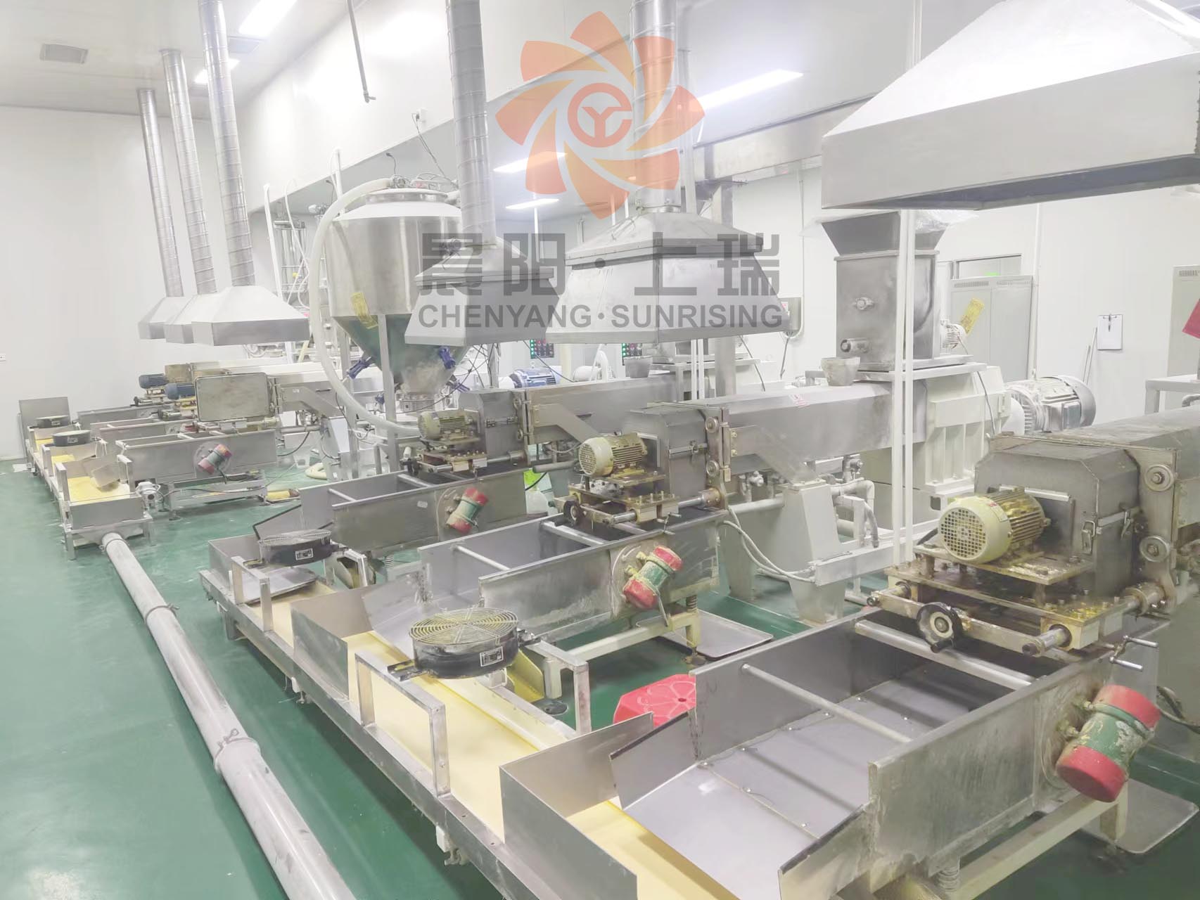 客戶因早餐營(yíng)養(yǎng)粉(沖調(diào)類營(yíng)養(yǎng)粉)市場(chǎng)需求不斷增加,產(chǎn)能需求日益旺盛增加,與晨陽(yáng)分多次訂購(gòu)營(yíng)養(yǎng)粉加工膨化設(shè)備,為保證產(chǎn)品的高質(zhì)量生產(chǎn),客戶生產(chǎn)車間使用無(wú)塵凈化車間。采用濟(jì)南晨陽(yáng)自主研發(fā)的新型62雙螺桿膨化機(jī),本型號(hào)的機(jī)器單機(jī)產(chǎn)能300公斤每小時(shí),本機(jī)型運(yùn)行穩(wěn)定,產(chǎn)品質(zhì)量在同行業(yè)排在前端,客戶用該機(jī)型24小時(shí)不間斷連續(xù)運(yùn)行,單機(jī)日產(chǎn)能7.2噸。該機(jī)型在客戶工廠經(jīng)住考驗(yàn),得到客戶的充分肯定。在日產(chǎn)7噸的產(chǎn)能下已經(jīng)復(fù)制6臺(tái)機(jī)器,擴(kuò)產(chǎn)到日產(chǎn)能到45噸,產(chǎn)能和質(zhì)量的穩(wěn)定在同行業(yè)已經(jīng)達(dá)到頂端??蛻舾鶕?jù)市場(chǎng)需求,已經(jīng)在研產(chǎn)新的生產(chǎn)線,規(guī)劃未來(lái),未雨綢繆!感謝客戶的信任,我們將一如既往的用熱情的服務(wù)和更高的質(zhì)量回饋客戶嗎,合作共贏,同謀發(fā)展!