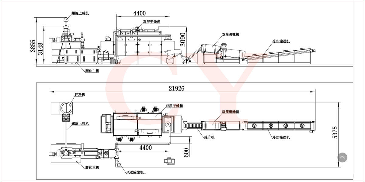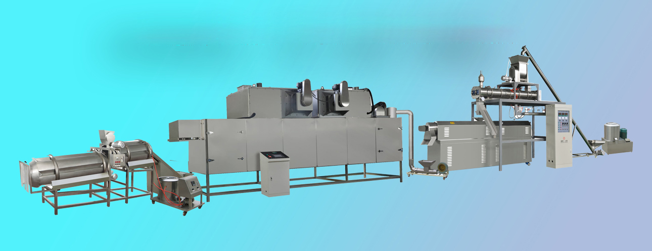 拌粉機(jī)→螺旋上料機(jī)→(調(diào)制)雙螺桿膨化機(jī)→風(fēng)送機(jī)→多層烘干機(jī)-滾筒調(diào)味機(jī)