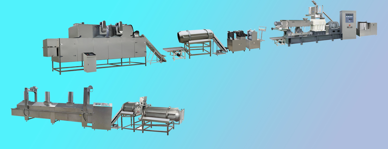拌粉機→真空上料機→雙螺桿膨化機→展平冷卻機→整形切斷機→提升機-篩選機-提升機-八米五層干燥機-油炸機-震動脫油機-單滾筒調(diào)味機