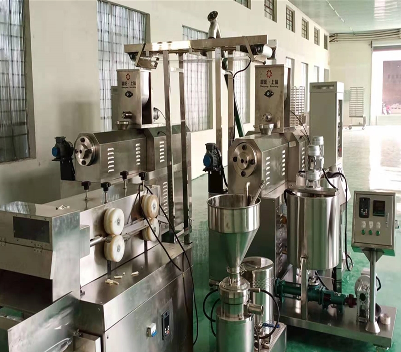 拌粉機→螺旋上料機→雙螺桿膨化機→夾心機-整形切斷機→提升機→六米五層烘干機-雙筒調(diào)味機
