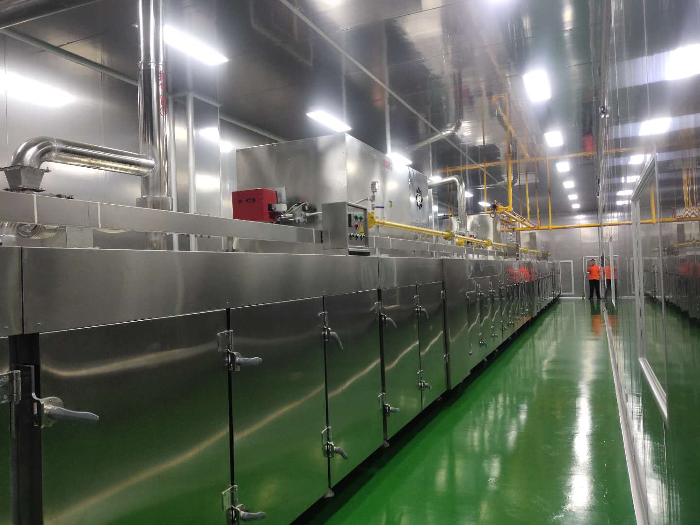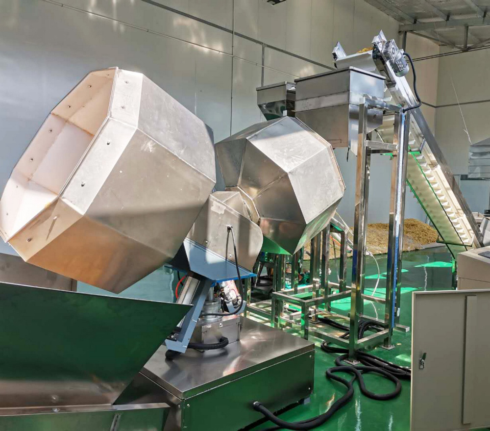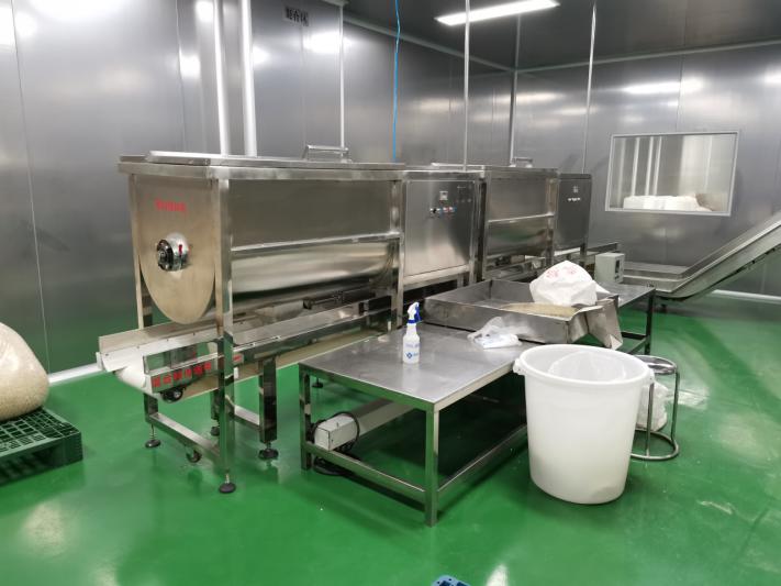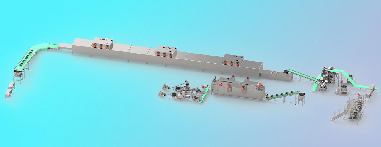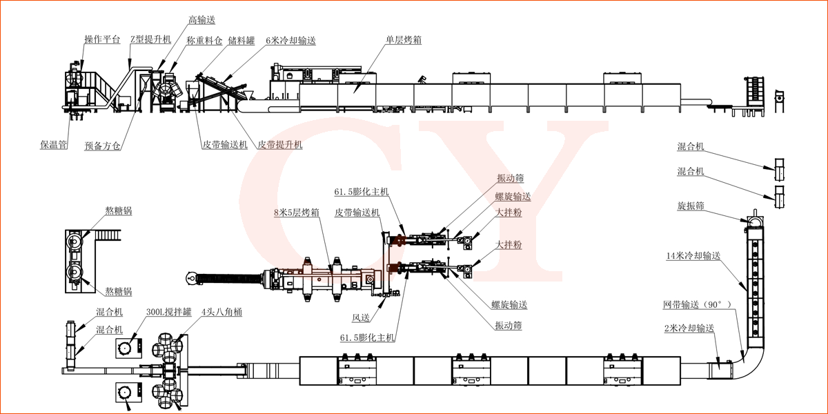 拌粉機→螺旋提料機→膨化主機→提升機→五層烘干機→冷卻機→混合機→熬糖設備→噴糖設備→提升機→單層高溫烘干機→冷卻機→振動篩